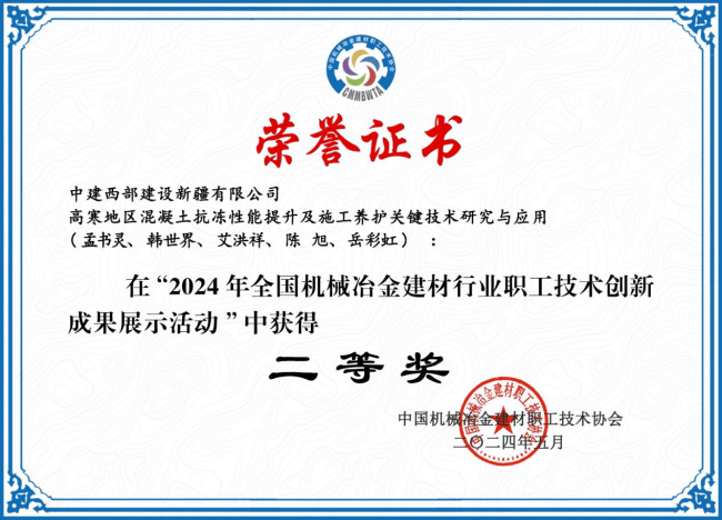 凭借扎实的科研实力,获股份公司专项经费支持130万余元,为企业持续创新提供了坚实保障;多项研究成果荣获2024年全国机械冶金建材行业职工技术创新成果展示活动二等奖、中建西部建设科技进步奖二等奖等,成果在股份公司和行业中广泛应用。